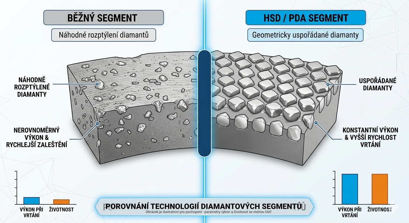 Rozhoduje materiál, ne náhoda Při výběru diamantového nástroje pro řezání nebo vrtání často narážíme na otázku: „Proč nemůžu použít jeden univerzální kotouč na všechno?“ Odpověď se skrývá ve fyzice a chemii diamantového segmentu. Správná volba vám ušetří peníze za zničené nástroje a drahocenný čas na stavbě. V tomto článku se podíváme na zoubek technologii, která mění pravidla hry – HSD (High Speed Drilling), známé také jako PDA (Positioned Diamond Arrangement).